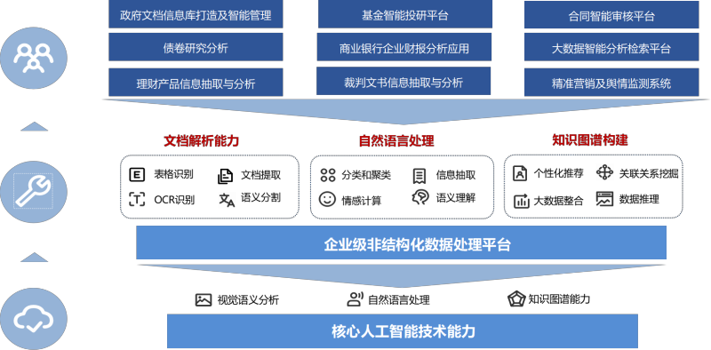 智能3499拉斯维加斯官网的企业级非结构化处理平台主要处理的是文档、影像件等非结构化数据,通过视觉语义分析和自然语言处理,将结构化数据转化为非结构化数据,后续根据不同业务场景对结构化数据进行关联与分析,协助人们快速的阅读、理解和分析各类文档内容,降低企业、政府及各种组织中文档的重复阅读、整理和分析的工作,提升非结构化数据处理效率及数据的流动、共享和使用能力。产品已经实现了金融行业(银行、证券、保险)、烟草、政务、财政税务等行业领域的场景落地,完成了良好的工程实现,并积累了大量的金融、政务和烟草行业市场化训练数据,形成了技术壁垒,可以在这些行业进行良好的拓展。