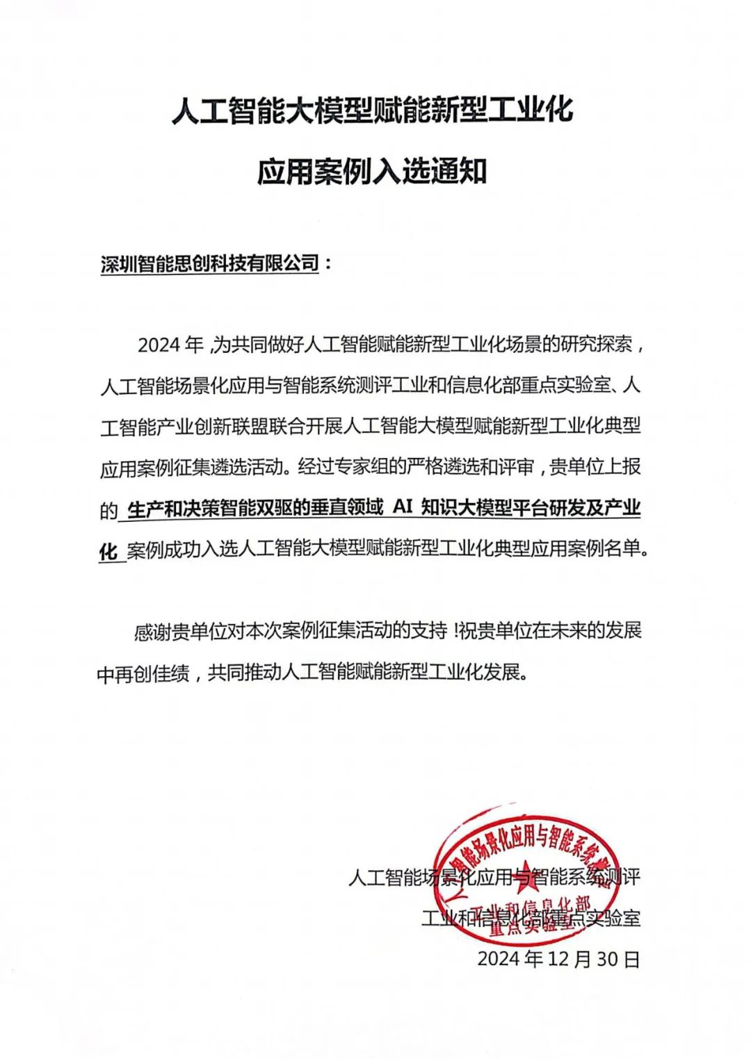 喜讯传来,砥砺前行!在我国大力推进新型工业化、发展数字经济的关键时期,智能3499拉斯维加斯官网的一款生产和决策智能双驱动的垂直领域AI知识大模型平台研发及产业化案例成功入选人工智能大模型赋能新型工业化应用案例!这不仅是对我们企业实力的认可,更是对我国人工智能产业发展的有力推动。