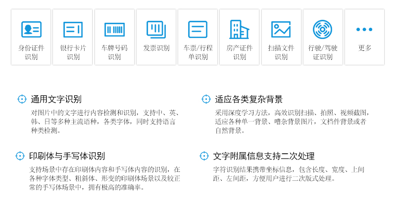 光学字符识别(OCR)利用深度学习方法,在CNN和RNN的基础上,研发改进图片文字识别的算法体系,并将之应用于发票、行程单、的士票、收据等各类票据,各类身份证件,各类银行卡片识别场景,为领域业务提供智能化服务。